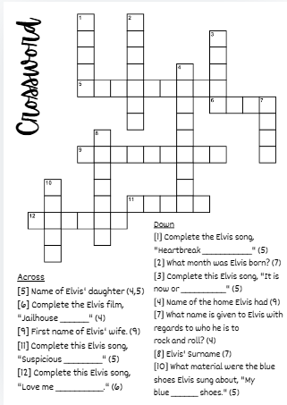 We have activity packs for every occasion. Our free sample on offer is on Elvis Presley, we have two packs, one is a sing-long and the other is about his life. One pack has a crossword, the other a Word search and the PDFs can be downloaded for free here